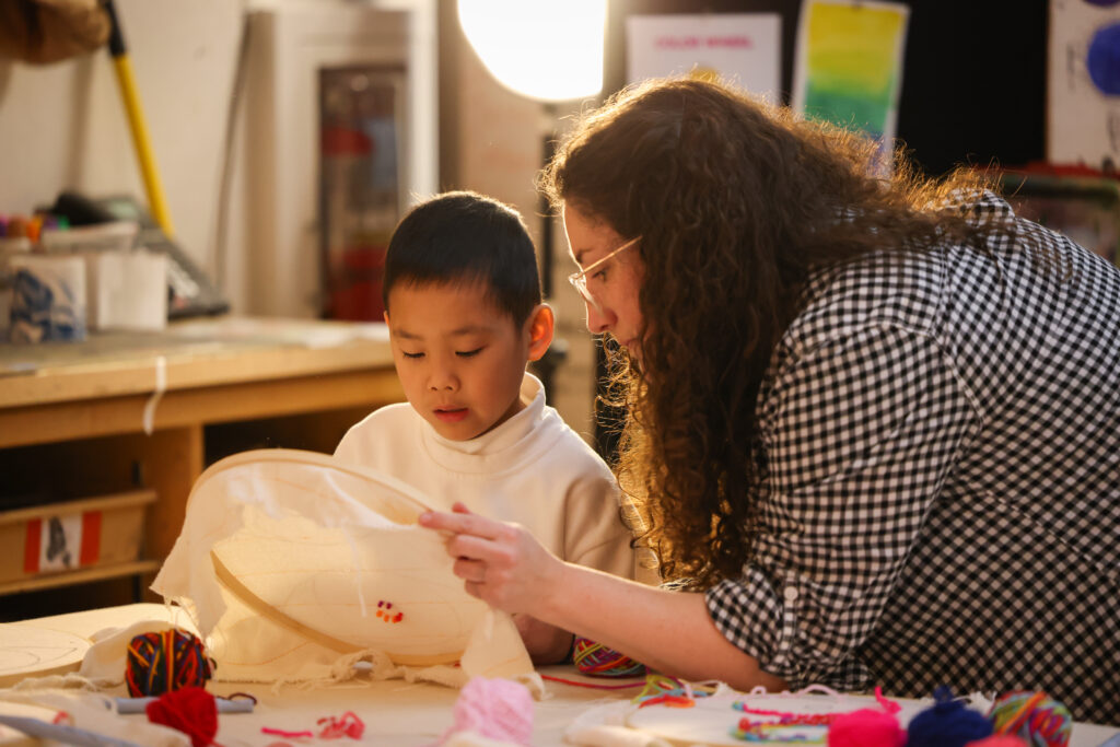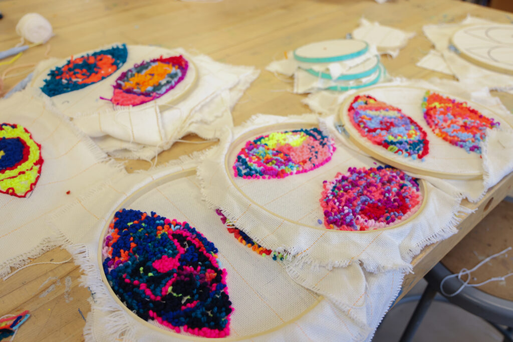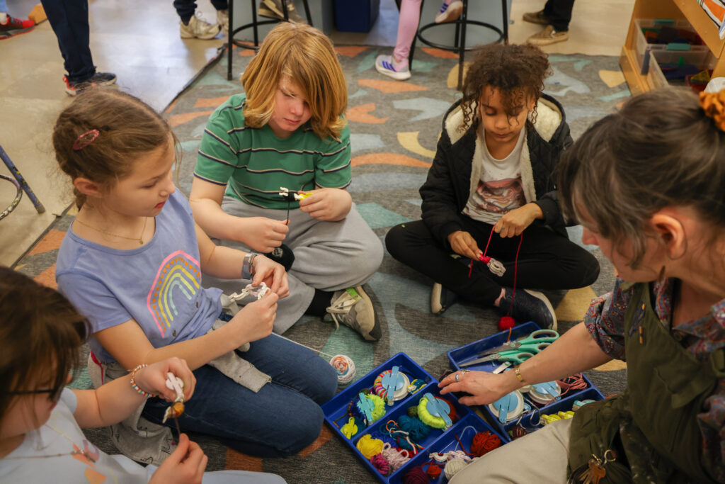 The Lower School welcomed Margaux McAllister as our 2025 Candace Freeman Artist-in-Residence. The Lower School Artist-in-Residence program is coordinated by Lower School art teachers, Kelly Nicholson and Jane Chesson. Margaux is a multi-disciplinary artist whose recent work has featured various fiber techniques to explore the theme of identity. Throughout the residency, Margaux worked alongside PK – 5th grade students during their art classes to teach the process of rug tufting using punch needles. Students learned about working collaboratively while practicing new fiber-based skills. They will be able to continue building upon this work as we integrate these new techniques into our Lower School Art Studios after the residency concludes. Margaux took the students’ work back to her Phoenixville studio to assemble a collaborative fiber work, and it was installed in the Lower School this spring. You can see the final piece in the Gathering Room.