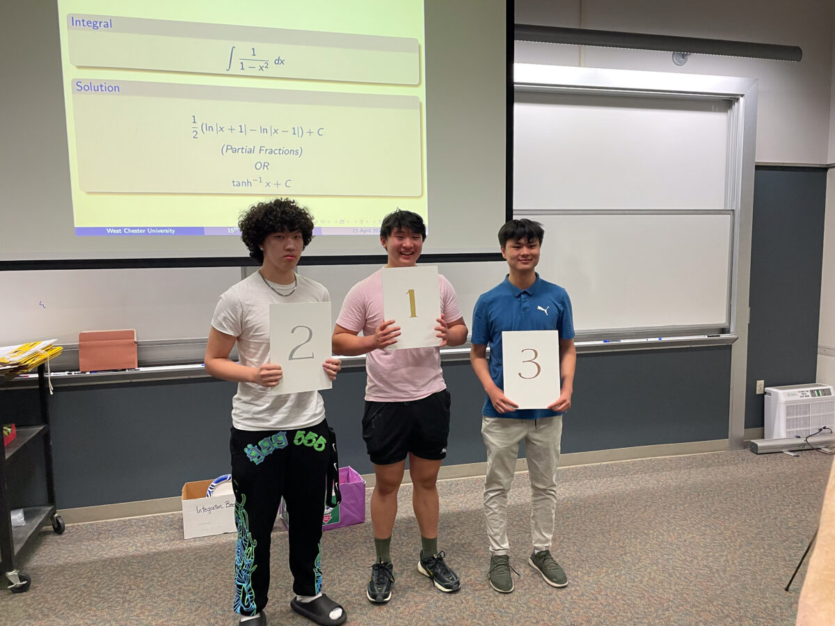 At the 2025 Integration Bee at West Chester University, Westtown students swept the podium earning the first, second, and third places! Third place in the high school division (along with a $50 gift card) went to Kyle Cui’25, second place and $75 went to junior Max Zhang ’26, and first place and $150 went to Jerry Rao’27. In the semi-final rounds, Westtown was very well represented with junior Tiantong Hu ’26 and sophomore Jamie Lee ’27. Tessa Kipnis ’26 and senior Vi Kanyamiheto-Watson ’25 also participated.