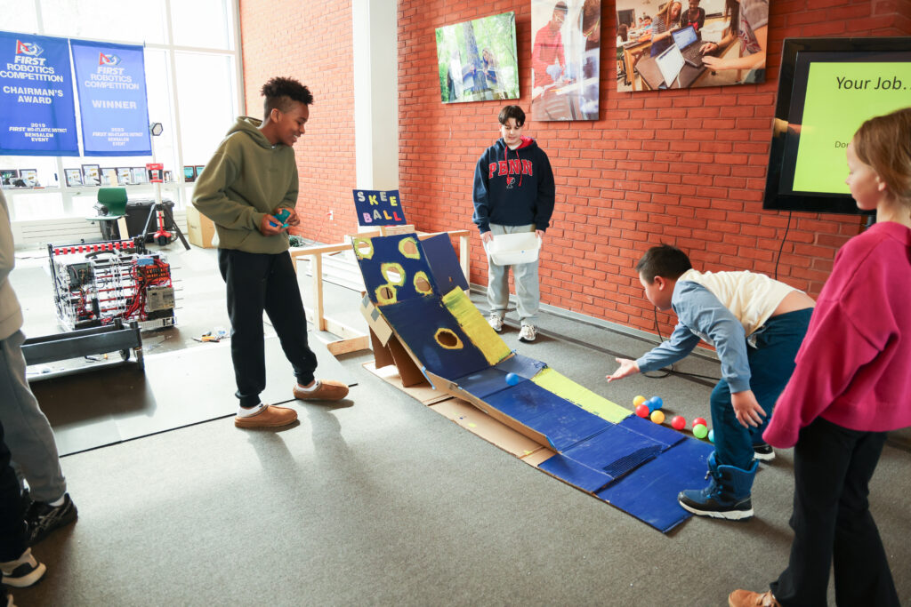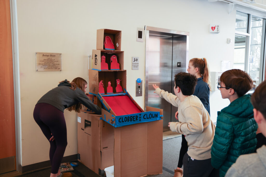 Science Teacher Carlos Charriez gave his seventh graders a design thinking task: create a carnival for your clients—Westtown fourth graders. Teacher Carlos gave them the following criteria for their carnival activities: they must be fun, engaging, challenging, made with cardboard, and cater to fourth graders. For this task, students divided into team to interview their clients and assess their needs and wants. They asked their clients and themselves about the best and worst elements of carnivals they’d been to and began to brainstorm ideas, then winnow them. Next they designed and made prototypes of their carnival games and activities. They tested their designs, got feedback, reflected on ways to make them better, and improved them. The project culminated in the Cardboard Carnival in which the fourth grade clients came to the Science Center to enjoy the final products, and enjoy them they did! See more of the carnival here.