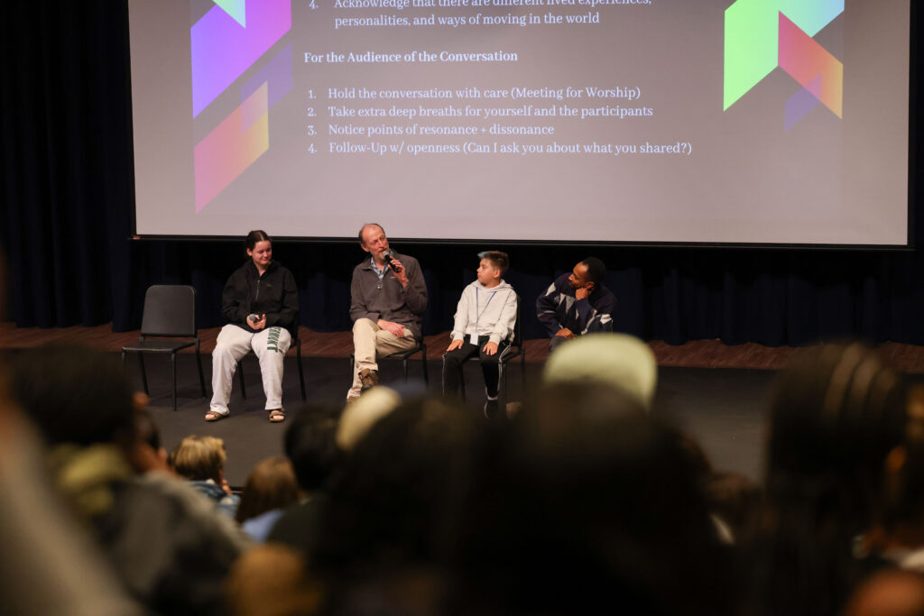 Dwight Dunston, a West Philly-based facilitator, hip-hop artist, educator, and activist, gave an assembly for our 7th-12th grade students about his work and Kingian Nonviolence, a philosophy and methodology for nonviolent conflict reconciliation developed from the work of Martin Luther King Jr. During the assembly, he led a few exercises with the audience and volunteer panelists, which inspired reflection and conversation.