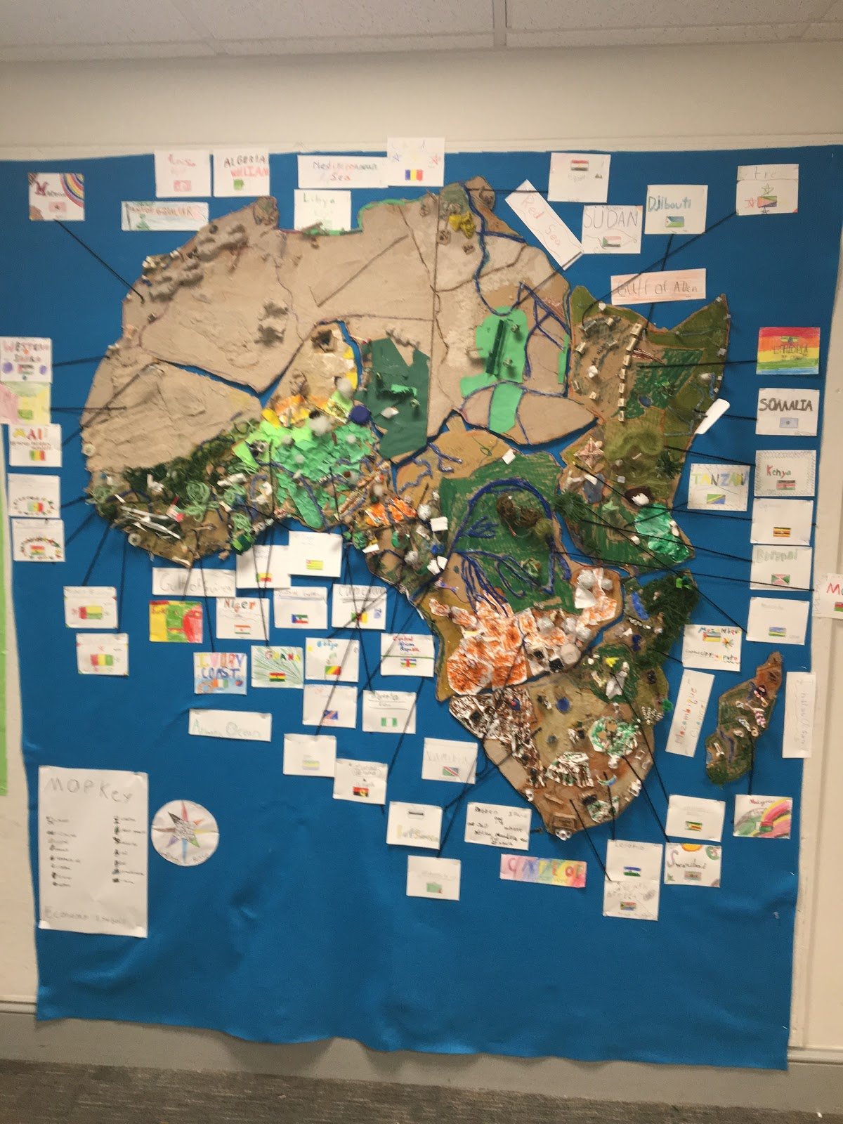 Working in small groups, third graders created a 3D topographic map of Africa. People often refer to the continent of Africa, but not the 55 specific countries that make up the continent. The aim of this project was to learn about the individual countries, and to dispel stereotypes about the continent as a whole. Teachers Vicki Shelter and Marc Dear divided the continent into six regions, and the students into six groups. Each group was given puzzle pieces that made up their region. These groups determined who was going to research each country within their region. They researched natural resources, land forms, bodies of water, populations, religions, and cities. After researching, the students built an enlarged version of their region. They learned to build on scale and to build economy symbols for things such as, mining, oil, coffee, and cacao. The creation of this 3D map brought together all of the geography lessons that third grade learned over the year.
